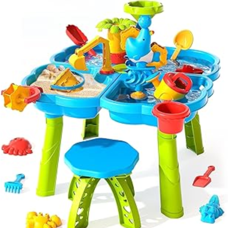 طاولة مياه ورمل 4 في 1 مع كرسي، مثالية لصيف ممتع ومليء بالنشاط الحسي واللعب الجماعي والإبداع للأطفال.